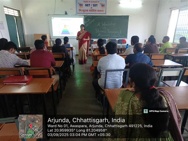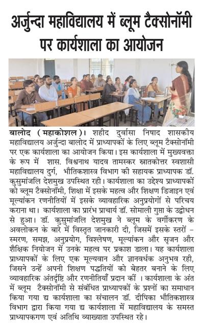 महाविद्यालय में प्राध्यापकों के लिए ब्लूम टैक्सोनॉमी पर एक कार्यशाला का आयोजन किया। इस कार्यशाला में मुख्यवक्ता के रूप में शास. विश्वनाथ यादव तामस्कर स्नातकोत्तर स्वशासी महाविद्यालय दुर्ग, भौतिकशास्त्र विभाग की सहायक प्राध्यापक डॉ. कुसुमांजलि देशमुख उपस्थित रही। कार्यशाला का उद्देश्य प्राध्यापकों को ब्लूम टैक्सोनॉमी, शिक्षा में इसके महत्व और शिक्षण डिजाइन एवं मूल्यांकन रणनीतियों में इसके व्यावहारिक अनुप्रयोगों से परिचय कराना था।